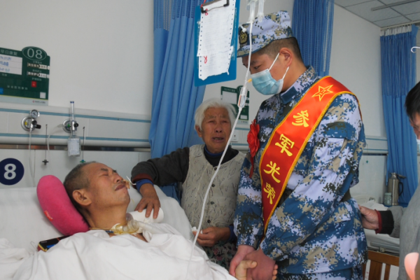 市人武部和相关单位负责人一起到医院看望了周家豪的父亲,希望他的父亲安心养病。