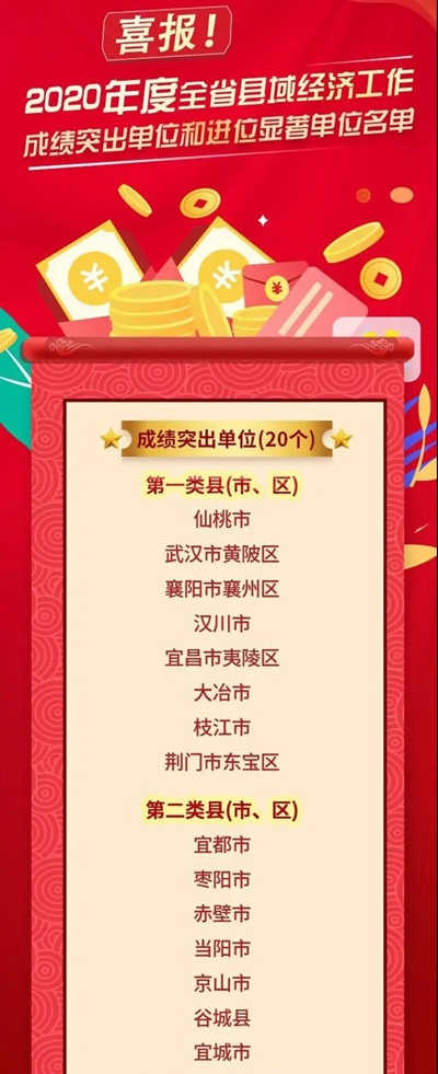 为进一步激发和调动各县(市、区)加快发展的积极性和能动性,更好推动县域经济高质量发展,湖北省委、省政府对20个县域经济工作成绩突出的县(市、区)和10个县域经济工作进位显著的县(市、区)予以通报表彰。