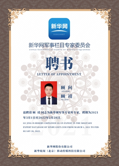 据了解,新华网军事专家智库是新华网军事内容的重要组成。近年来,广大群众越发关注军事、关注国防,为及时传播、发布相关专业信息,回应民众关切,新华网在加强权威军事新闻的报道外,引入了多位知名专家组建新华网军事专家智库,顾靖作为军事题材创作者,常年从事军事作品创作,致力于国防教育科普,拥有较高人气,此次也成功加入新华网军事专家智库,成为新华网军事栏目顾问。