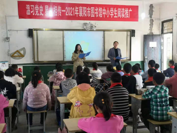 本网讯通讯员谢江华 付海丰报道:在建党100周年和第26个世界读书日来临之际,4月15日,襄阳市图书馆来到宜城市郑集镇何骆小学,开展“温习党史 星火相传”中小学生阅读推广活动。