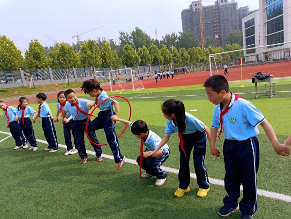比赛分为上午场和下午场。上午,分年级进行了"一圈到底"、迎面运球接力、跳绳、旋风跑四个项目的比赛。下午,进行了"二人三足"和师生拔河比赛。