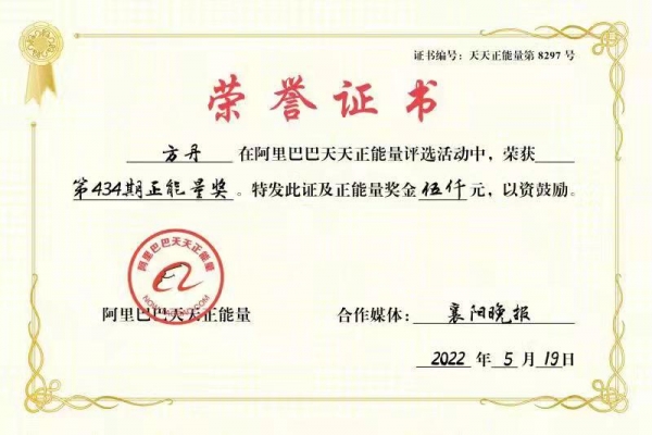 本网讯记者李勤 周波 通讯员谭杰 徐振全报道:近日,阿里巴巴天天正能量联合襄阳晚报,授予宜城市朱市爱心粥店长方丹“正能量奖”,并给予5000元奖励。