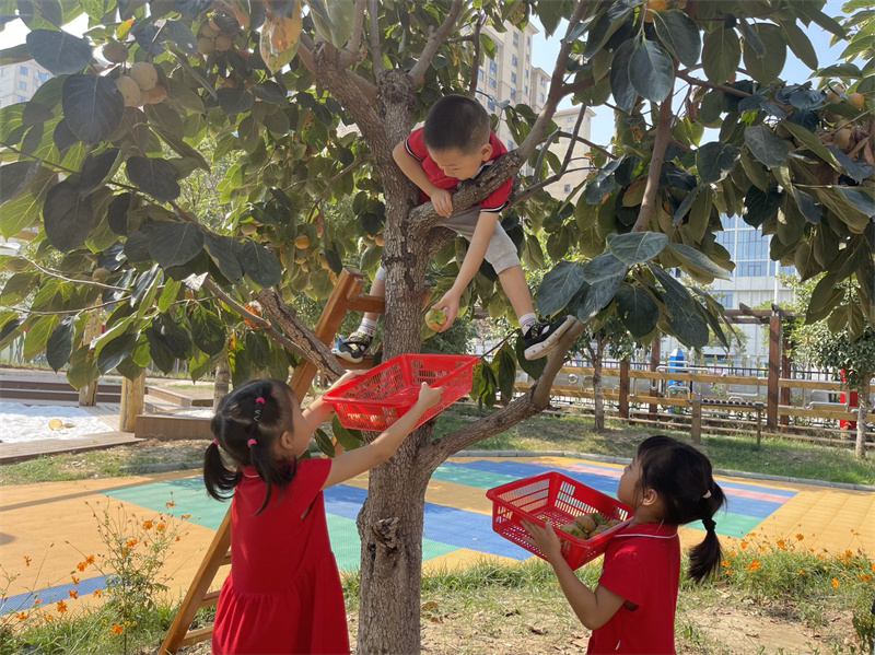 金秋时节,黄灿灿的柿子挂满枝头,成了该幼儿园里一道靓丽的风景,更是一种甜蜜的馈赠。生活即教育,大自然就是孩子们最好的课堂。采摘前,孩子们都做了充分的准备。采摘活动开始后,有的孩子合伙搬来了梯凳,有的勇敢地爬到了树上,有的站在梯子上摘,有的孩子拿着筐子在下面接着,有的在树下指挥着,幼儿们一个个忙得兴高采烈、不亦乐乎!