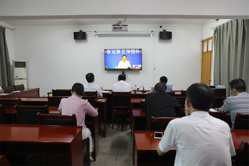 市领导蔡正方、张红波在我市疫情防控指挥部参加调度会。