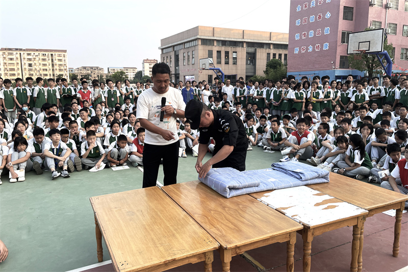 军训期间,派出所应急处突队的教官们既严肃认真,又寓教于乐,从军姿要领到床褥整理,耐心细致地为每一名同学讲解,手把手地纠正错误动作。同时,教官们还向学生展示了刚劲有力的擒敌拳、行云流水的应急棍术,赢得了现场同学们的阵阵欢呼和热烈掌声。