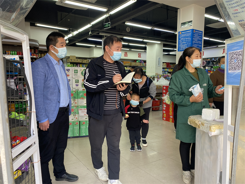检查组深入到学苑社区、窑湾社区、好邻居超市、行政审批局等11个点位检查。每到一处,检查组仔细检查门口是否有专人值守,是否对外来人员进行体温检测和信息登记,门口显著位置是否张贴有疫情防控宣传知识或标语,音箱喇叭循环播放疫情防控提醒和要求。