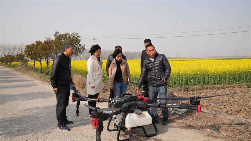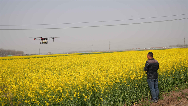 在技术人员的操控下,植保无人机按照预先设定路线,精准有序开展施药作业,为千亩油菜披上了一件健康"外衣"。