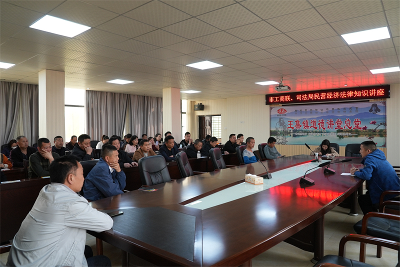 在王集镇政府,30多名王集商会会员企业负责人参加了民营经济法律知识讲座,3名专业法律工作人员分别从农产品诚信交易法律法规、如何规避企业法律风险、如何保障企业合法权益等方面进行专题授课。