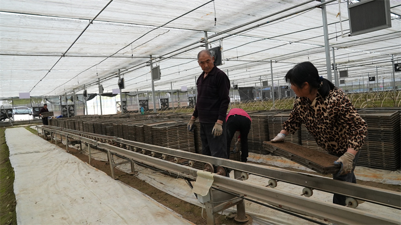 4月13日,在宜城杨光农业合作社的育秧工厂里,记者看到,工人们正在忙碌着在机器上摆放育秧盘、装填育秧基质和水稻种子,自动水稻育秧流水线马力全开,一派繁忙景象。早一批育下的水稻种子已冒出嫩绿的 "头",生机勃勃。
