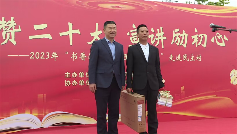 襄阳职业技术学院马克思主义学院院长叶朝为雷河镇民主村现场赠送书籍和电脑,希望通过此次活动,不断推进“理论下基层,书香溢襄阳”活动开展,带动更多的群众参与到全民阅读中来,让所有人都可以与书为伴,多读书、读好书,让读书成为习惯,让读书成为乐趣。