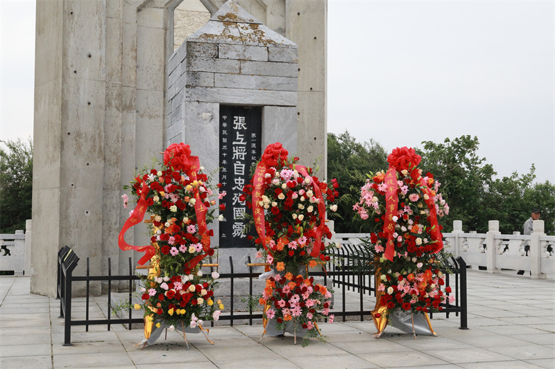英雄名千古,后人不相忘。上午9时,凭吊仪式正式开始,在场全体人员向张将军纪念碑敬献花篮并行三鞠躬礼,深切缅怀张将军的抗日功绩,弘扬英烈精神。