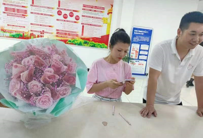 当天一大早,笔者在登记处门口看到,有的新人在现场排队等待领证,有的新人们手捧鲜花在亲人的陪伴下拍照留念,办证大厅到处洋溢着甜蜜的味道。