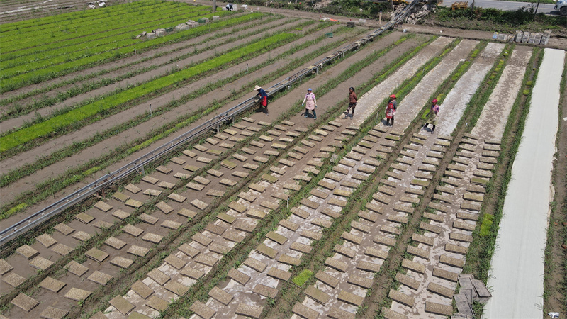 当前正是水稻插秧时节。这两天,宜城市杨光农机专业合作社托管的12000亩早稻田正在插秧。在郑集镇双龙村村民程大国的秧田里,一盘盘秧苗在农机手的操作下,均匀整齐地插在田间,又快又好。和往年的机械化插秧相比,专业农机手使用的智慧化高速插秧机效率提升了3至5倍。