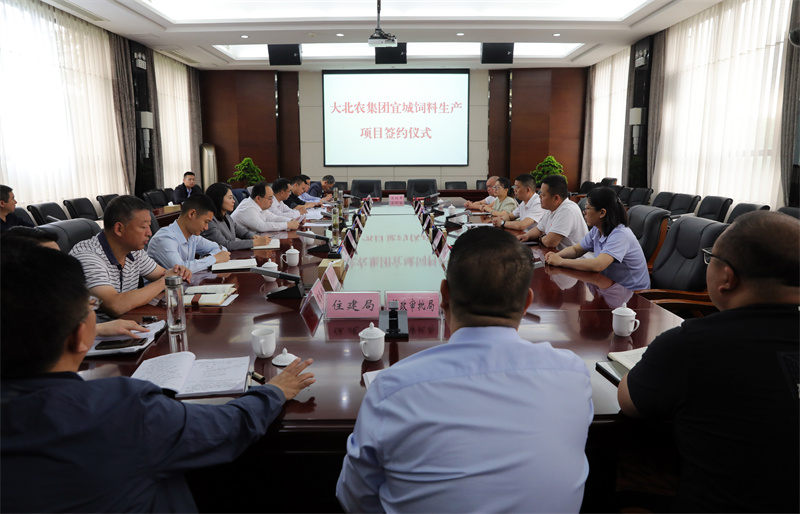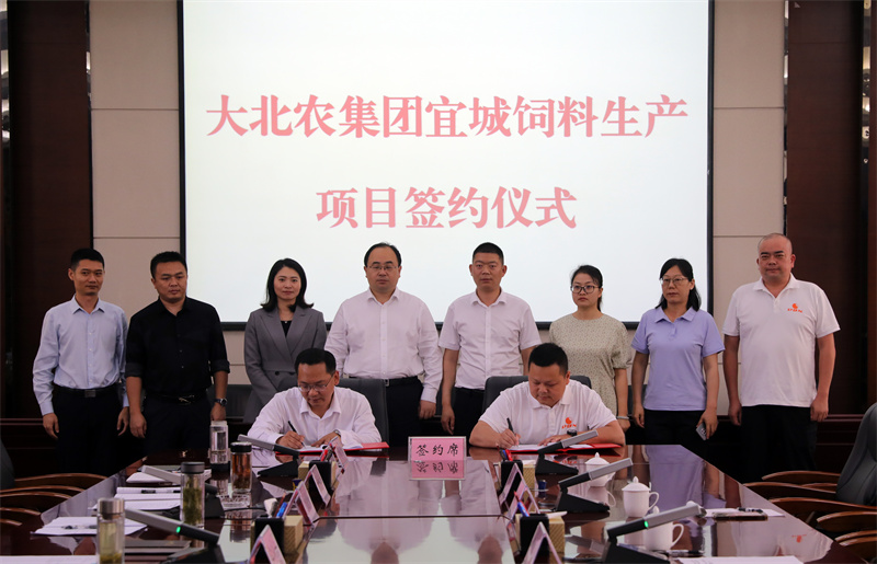 大北农集团湖北区总裁助理、湖北区项目总监杨文志与宜城市委常委、副市长朱晓林签订《宜城市人民政府与武汉大北农农牧发展有限公司关于投资建设年产24万吨饲料项目的合同》。