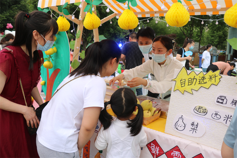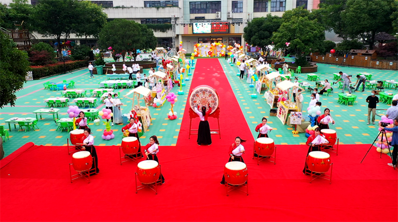 活动现场,老师们英姿飒爽,挥舞着跳动的鼓槌,拉开了游园会的序幕。孩子在家长的陪伴下,一起涌入“宜城文化街”。吃一只宜城大虾、撸一串板桥烧烤、尝一块流水西瓜......期间还体会到各种传统民间游戏,占花卜、套圈、射羿、投壶、捏泥人......让孩子们度过一个丰富多彩的别样“六一”儿童节。