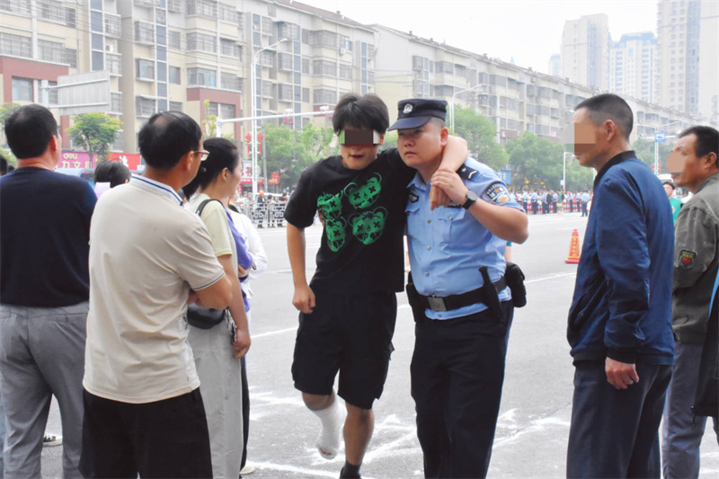 小飞的母亲当时心里非常着急,也不知道如何解决,第二天将小飞用电动车载到考点。热心民警发现这一情况,立即上前帮扶。在民辅警和同学的帮助下,小飞顺利完成第一天的考试。