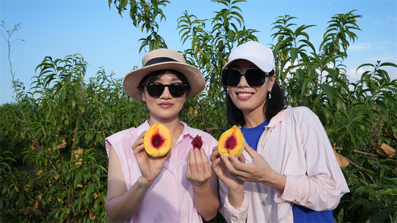 "听说王台村一组的黄桃特别好吃,今天我们特意驱车过来来到这个桃园。"游客丁玉敏说,"这个黄桃真大,外面黄黄的里面呢是红红的,第一次吃这么好吃的桃子。"