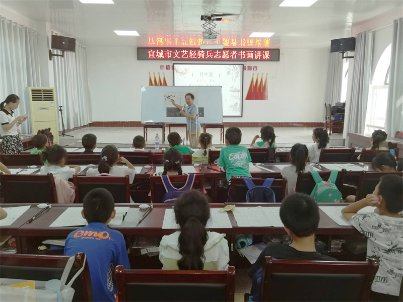 “首先我们学习写点,同学们试着在纸上写一下老师看看……”“大家知道中国最出名的几位画家是谁吗?”活动现场,文艺志愿者正在详细讲解着如何握毛笔、写字笔画及绘画的基本知识等,随后又为孩子们亲手示范毛笔字的书写方法以及绘画的顺序。