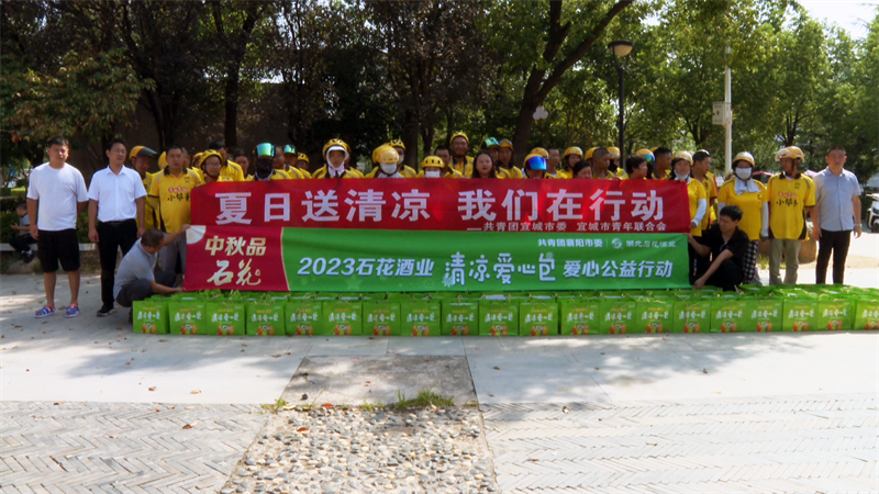 本网讯记者刘毅 通讯员刘雨蒙报道:炎炎烈日下,顶高温、战热浪的户外劳动者令人尊敬,也需要更多人的关心。8月23日,共青团宜城市委联合石花酒业,为户外劳动者送去"清凉爱心包"。