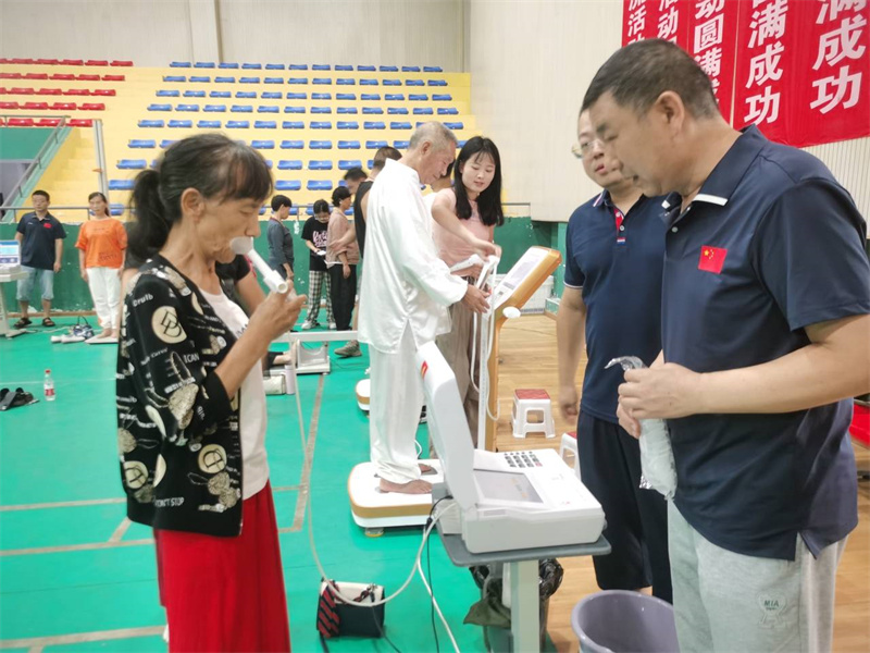 在宜城体育馆,工作人员搭建起体测设备,耐心细致地为受测对象进行监测。通过系统分析对每人各项监测数据进行综合评估分析,现场出具体质评估报告,并为每名受测对象详细讲解、分析评估报告,提供健身咨询和服务。