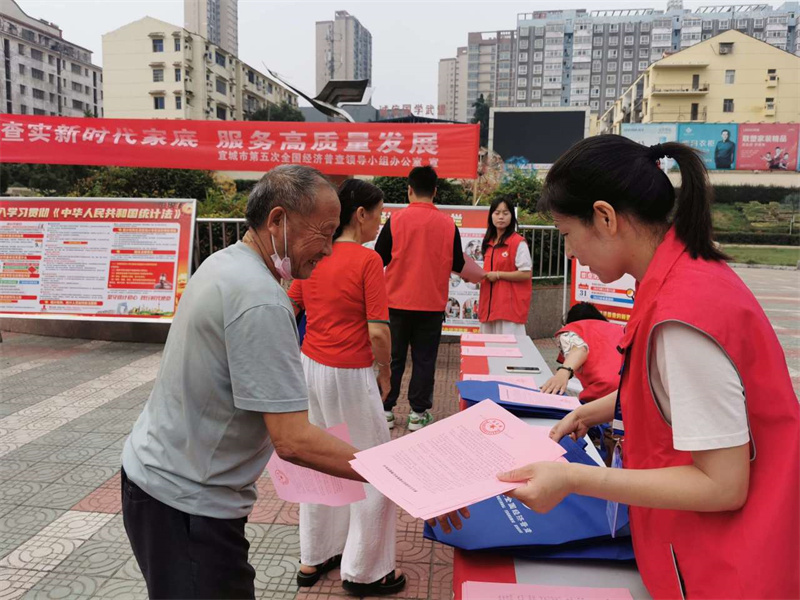 在紫盖山广场,市统计局精心布置了主题宣传展板、宣传横幅及宣传语音,向前来咨询的群众发放宣传资料、解疑答惑,积极宣传第五次全国经济普查的目的和意义,以及普查对象、普查内容、普查方式、普查特点、统计法律法规等,让更多群众了解统计知识、感受统计魅力,展现经济普查服务国家发展的重要作用,提高"五经普"的知晓率和参与率。