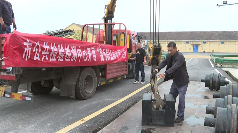 检定中,工作人员一边用检定专用车吊起一吨重的砝码平稳放在地秤上,一边对地秤的灵敏度、准确度、稳定性等各种计量性能进行了检定。对于检定合格的地秤现场张贴绿色合格标签,对于检定不合格的当场进行校准调试,确保计量数据真实可靠。