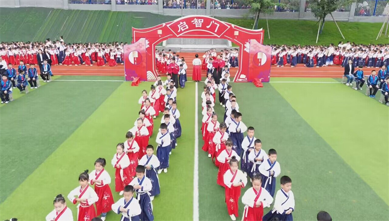 活动中,宋玉小学500多名一年级学生排着整齐的队伍,依次通过启智门,全体学生整肃衣冠,向孔子行深揖三拜礼,庄重向至圣先师致敬;参加活动各单位相关负责人及该校一年级各班老师分别为学生们点朱砂启智,意为开启智慧,以此寄托美好的愿望,从此眼明心亮。