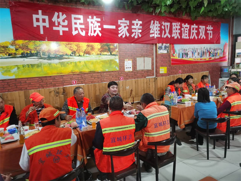向环卫工人捐赠生活物资后,艾散又邀请环卫工人到自己经营的玉石烧烤店,亲手宰了一头肥羊请大家品尝美食,并和大家一起弹起了都塔尔、跳起了民族舞、唱起了《没有共产党就没有新中国》,共同庆祝中秋佳节和祖国生日。