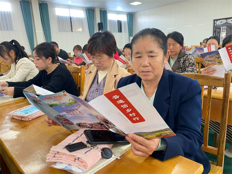 培训现场,省新华书店有限公司宜城分公司为学员们送去普通话的教材。普通话授课教师为村民们发放"普通话乡村行"宣传册,向村民普及推广普通话知识,围绕"村民常用语50句"集中授课,耐心帮助村民纠正发音,提高他们的普通话沟通交流水平。