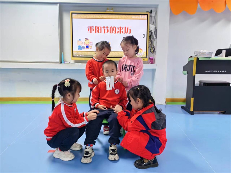 升旗仪式后,老师们通过故事、绘本、视频、儿歌等多种形式,引导孩子们深入了解重阳节,以及登高、赏菊、插茱萸、吃糕等相关习俗。