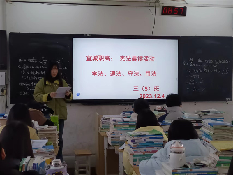 高一、高二、高三各班级举行“宪法晨读”仪式,老师或班级干部领读,从宪法的地位、基本内容、公民的基本要求等方面进行了详细生动的宣读。在12月4日举行的升旗仪式上,全校学生进行了集体晨读活动。同时,学校LED电子屏滚动播出宪法宣传标语。