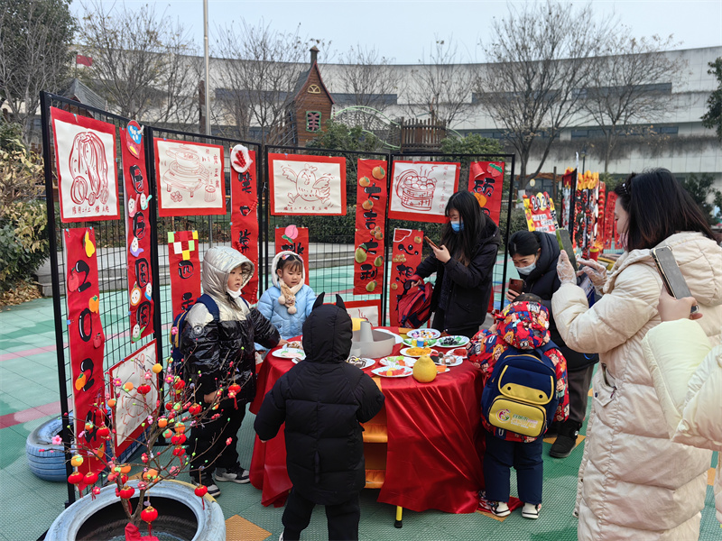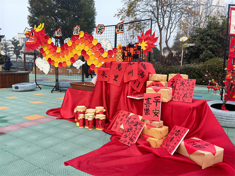 一走进实验幼儿园,就看见红红的灯笼高高挂起,“五谷丰登”的摆台上花生、瓜子、桂元、红枣、玉米……象征收获满满,栩栩如生的祥龙环绕各个大型玩具区,热气腾腾的“火锅”象征团团圆圆,一串串鞭炮、一幅幅对联、一张张福字,让的新年气息扑面而来。