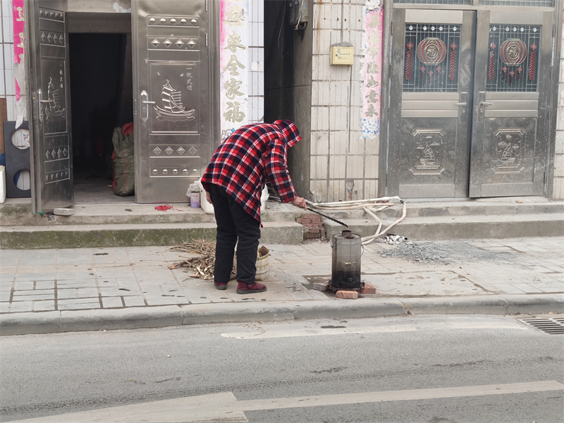 1月15日,在丁家巷内,记者看到有住户在户外烧柴火炉,现场扬起浓烟,影响周围环境。巷内部分位置电线混乱,存在安全隐患。