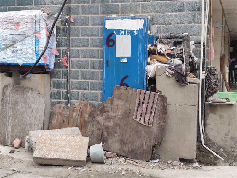 在建筑公司小区,记者看到小区内存在电线杂乱、电动车飞线充电、垃圾乱丢乱堆、占用消防通道等多个不文明现象,在小区墙面上还漆上了小广告,影响了小区环境。