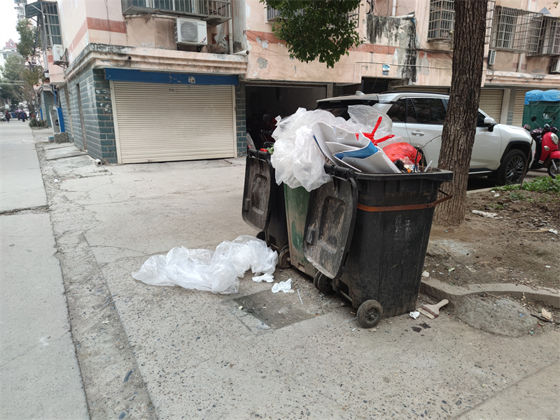 在中华园小区内,墙面上漆了许多小广告,门面房前堆放了许多杂物;垃圾桶已满未及时清理,一些垃圾随意丢在路边;在小区绿化带上还堆放了许多杂物,给小区环境卫生抹上了不和谐的色彩。
