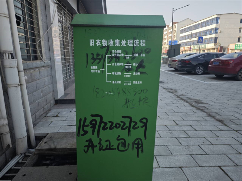 在芦苇办小区门口的墙面上以及旧衣物收集处理箱上漆上了很多小广告,影响市容市貌。