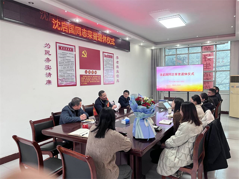 仪式上,宜城市委老干部局主要负责人介绍了退休同志沈启国的主要情况,局班子成员为退休干部佩戴绶带,年轻干部代表为老同志献上鲜花。