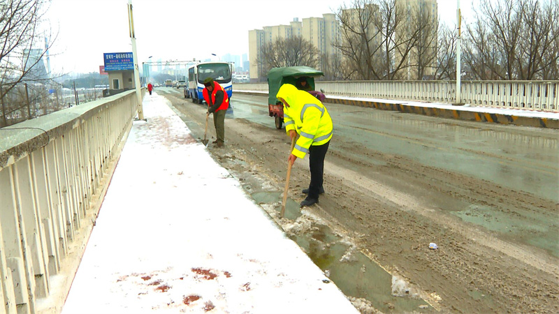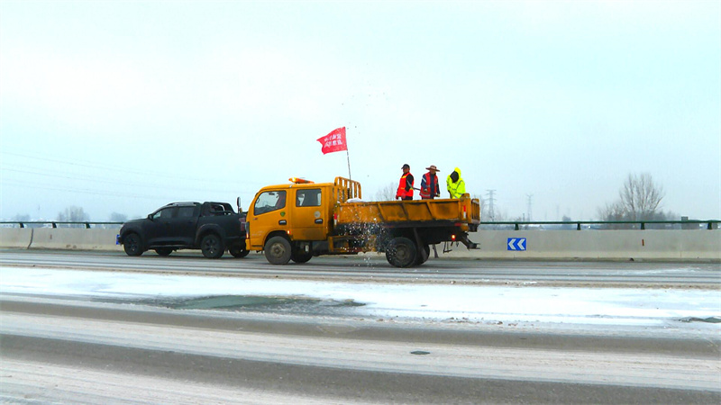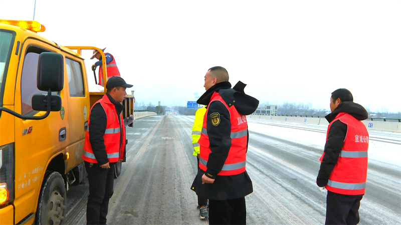 在宜城汉江大桥及部分国道线上,一辆辆黄色工程车在风雪中来回穿梭,车上的工人正用铁铲将融雪剂均匀洒向路面。大家按照除雪保畅工作规程,抢抓最佳除雪时机,以"人工+机械"的方式,对主干道及国省干线开展巡回除雪。在桥梁、急弯陡坡、背阴等容易积雪的路段,加大融雪剂、防滑料的撒布力度,尽可能消除安全隐患。