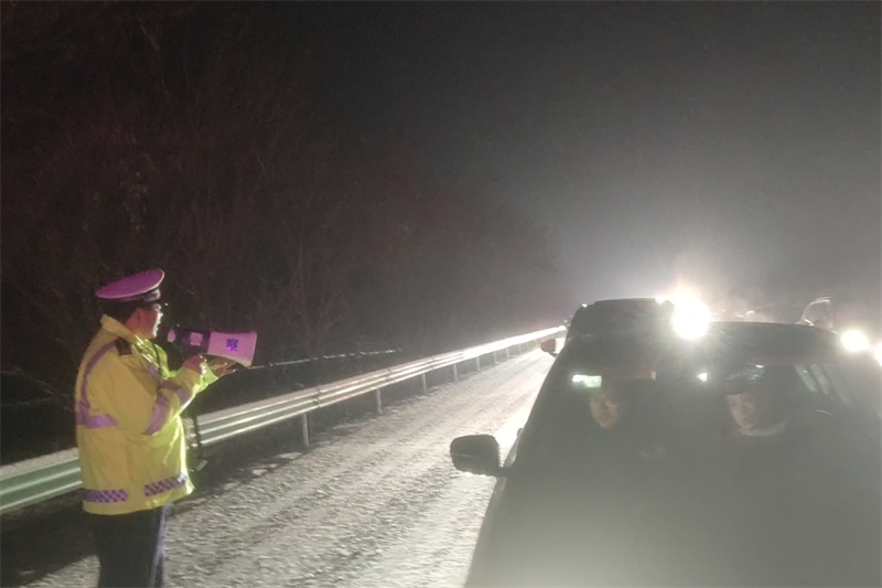 当日,高速公路部分路段积雪结冰,道路通行不同程度受阻。交警沿途用警笛、喇叭持续提示司机,保持安全车速和车距,严防再次发生事故,确保车辆安全通行。