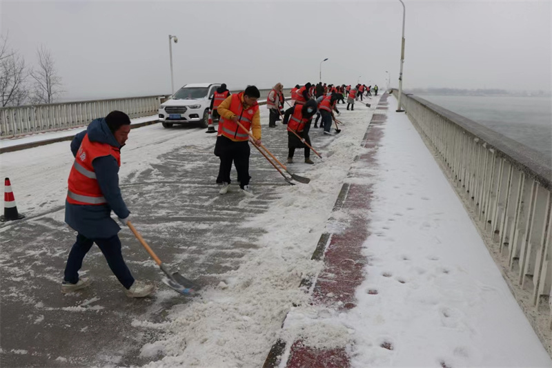 2月20日降雪以后,宜城市公路管理局立即启动雨雪天气应急响应,与交警、交通、应急管理局、市政、环卫等部门建立联动机制,针对巡查反馈的汉江大桥、倚天大桥、孔湾大桥、莺河大桥、界山等多条国省干线路面、桥面积雪、结冰和湿滑现象,迅速组织除雪保畅应急队伍、机械设备投入除雪融冰工作,突出陡坡、弯道、桥梁等重点区域,清扫积雪,抛洒融雪剂,全力消除安全隐患。此外,针对汉江特大桥梁积雪结冰、机械施工困难等情况,宜城市公路管理局、湖北经天路桥有限公司成立的150人志愿除雪应急队伍,人工开展除雪保畅工作。通过一系列的积极应对措施,路面结冰现象得到了有效缓解,有力保障了公路的安全畅通。