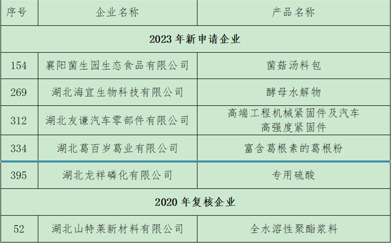 本网讯通讯员高文报道:近日,省经信厅公示了2023年度湖北省制造业单项冠军企业名单,宜城6家企业榜上有名,其中1家复审企业,5家新申报企业。至此,全市省级制造业单项冠军企业(产品)总数增至12家,涵盖装备制造、农产品、纺织服装、精细化工、新能源新材料等多个行业。