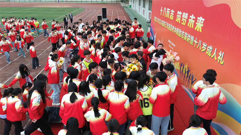 鲜活的事例和真挚的情感点燃了学生的斗志和决心,同学们纷纷走上舞台,昂首挺胸、满怀豪情地喊出了自己心仪的大学校名,这份对未来的坚定信念响彻校园,震撼人心。随后,他们与朝夕相处的老师深情拥抱,这是他们从少年走向成人的温暖过渡,也是师道传承的无声致敬。