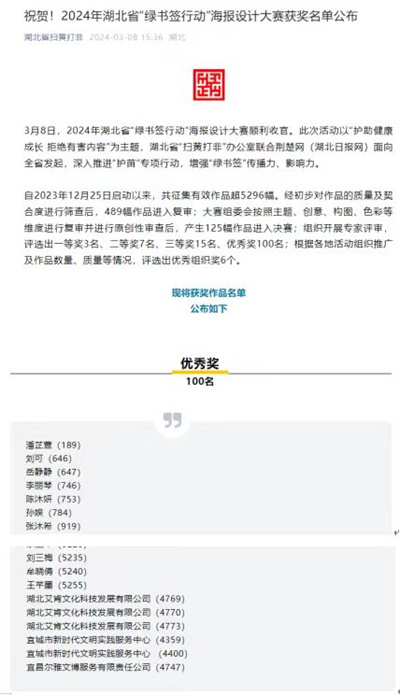 据了解,2024年湖北省“绿书签行动”海报设计大赛以“护助健康成长 拒绝有害内容”为主题。自2023年12月25日启动以来,共征集有效作品超5296幅。经初步对作品的质量及契合度进行筛查后,489幅作品进入复审;大赛组委会按照主题、创意、构图、色彩等维度进行复审并进行原创性审查后,产生125幅作品进入决赛;组织开展专家评审,评选出一等奖、二等奖、三等奖和优秀奖。