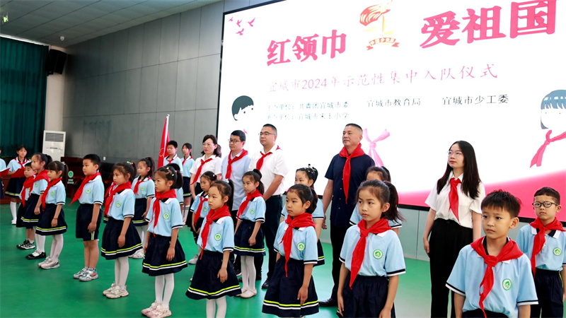 本网讯记者周波 通讯员董江宇 钟凌冉报道:5月30 日,由共青团宜城市委、宜城市教育局主办的宜城市 2024年少先队示范性集中入队仪式在宋玉小学举行,近200名师生代表共同见证了这一激动人心的时刻。