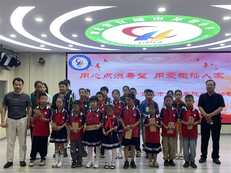 本网讯通讯员许娥 李海燕报道:5月31日,在第74个“六一”国际儿童节到来之际,宜城市余彬医院走进环翠小学教联体,开展“用心点燃希望·用爱撒播人家”慈善捐赠活动,向该校捐赠了1万元的爱心助学金。