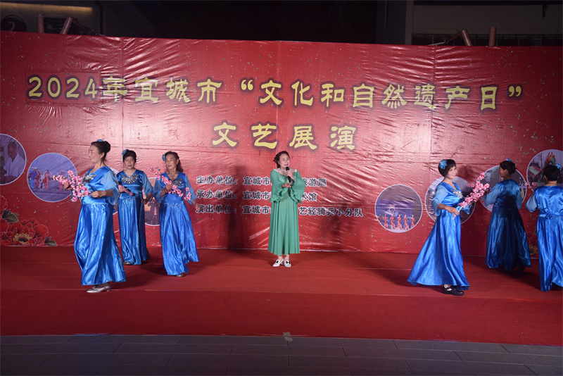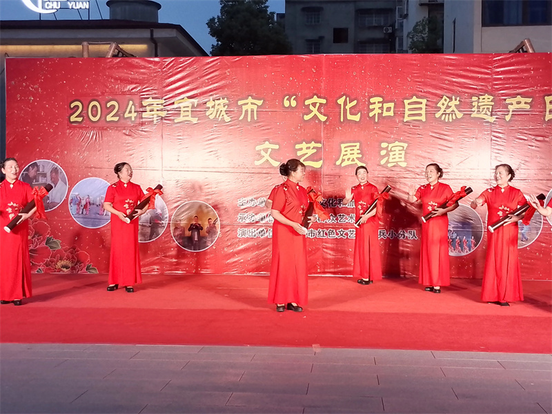 本网讯通讯员杨亦逍 李敏瑞报道:6月3日晚,由宜城市文旅局主办,市群艺馆承办、市红色文艺轻骑兵小分队参演的宜城市“文化和自然遗产日”文艺展演活动在楚宜青创园举行。