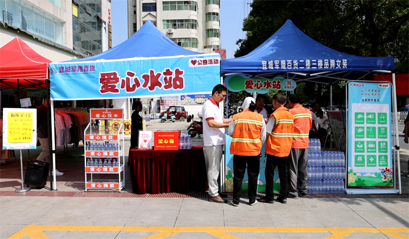 ÔÚ¾üÏè°Ù»õÃſڣ¬°®ÐÄÆóÒµ¾üÏè°Ù»õÉèÁ¢°®ÐÄˮվ£¬·²ÊÇ»·ÎÀ¹¤ÈË¡¢½¨Öþ¹¤ÈË¡¢ÍâÂôС¸ç¡¢¿ìµÝС¸ç¡¢¾¯ÎñÈËÔ±¡¢Ò½ÎñÈËÔ±µÈ¶¼¿ÉÒÔÃâ·ÑÁìÈ¡£¬Îª¸ßÎÂϵġ°Ã°º¹Õß¡±ËÍÈ¥Ò»ÏßÇåÁ¹¡£