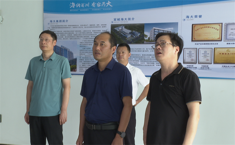 在宜城海大生物科技有限公司与湖北楚城光大农业有限公司,付青峰、向中华一行通过观看宣传片、听取企业负责人汇报等形式,详细了解饲料生产加工、生猪养殖企业生产经营以及养殖废弃物综合处理利用情况,并就有关生猪产业链建设进行座谈交流。