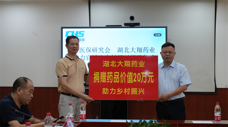 本网讯记者邬玲玲 通讯员屈思雨 朱未末报道:7月27日,在省医疗保险研究会的带领下,湖北大翔药业将价值20万元的药品捐赠给了宜城市中医医院及其医共体成员单位,以实际行动支持宜城市医疗健康事业发展,助力乡村振兴。省医疗保险研究会首席研究员、省医保局原二级巡视员曾青松,宜城市副市长杨海涛参加捐赠仪式。