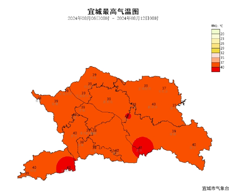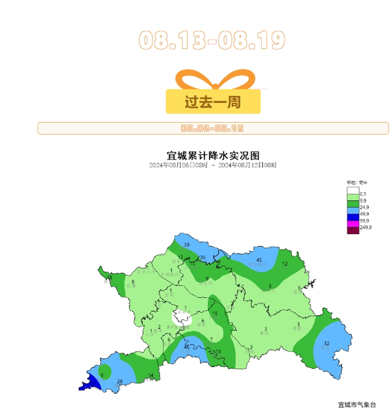 过去一周宜城以晴热天气为主,局部伴有降水过程。宜城站过程累计降水量达0.5mm,,日最高气温38.8℃,最低气温25.1℃。